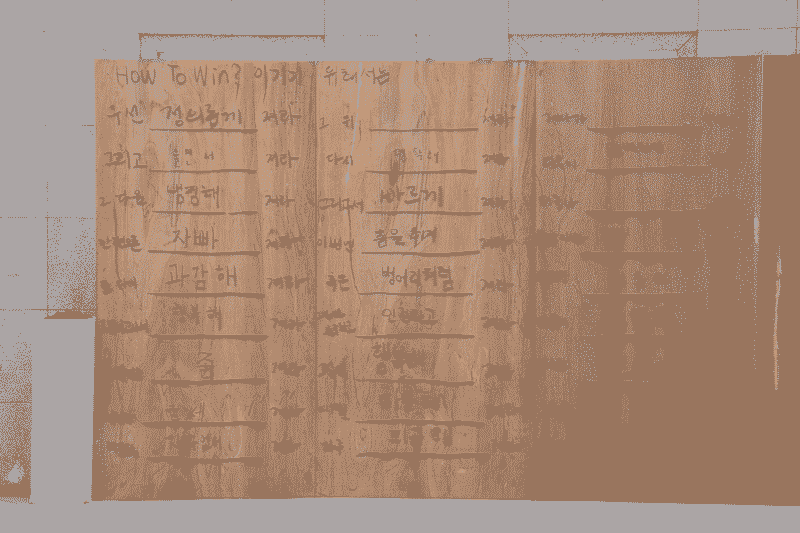 how to win is a participatory installation in which visitors are asked to fill in the blank of the phrase “To win, you must lose ____,” written repeatedly on plywood panels. The work questions the dominant narratives of competition and success, suggesting that losing can also be an act of solidarity. Rather than celebrating individual victory, it reflects on the value of shared defeat—the idea that through the experience of losing together, we might someday learn how to truly win.