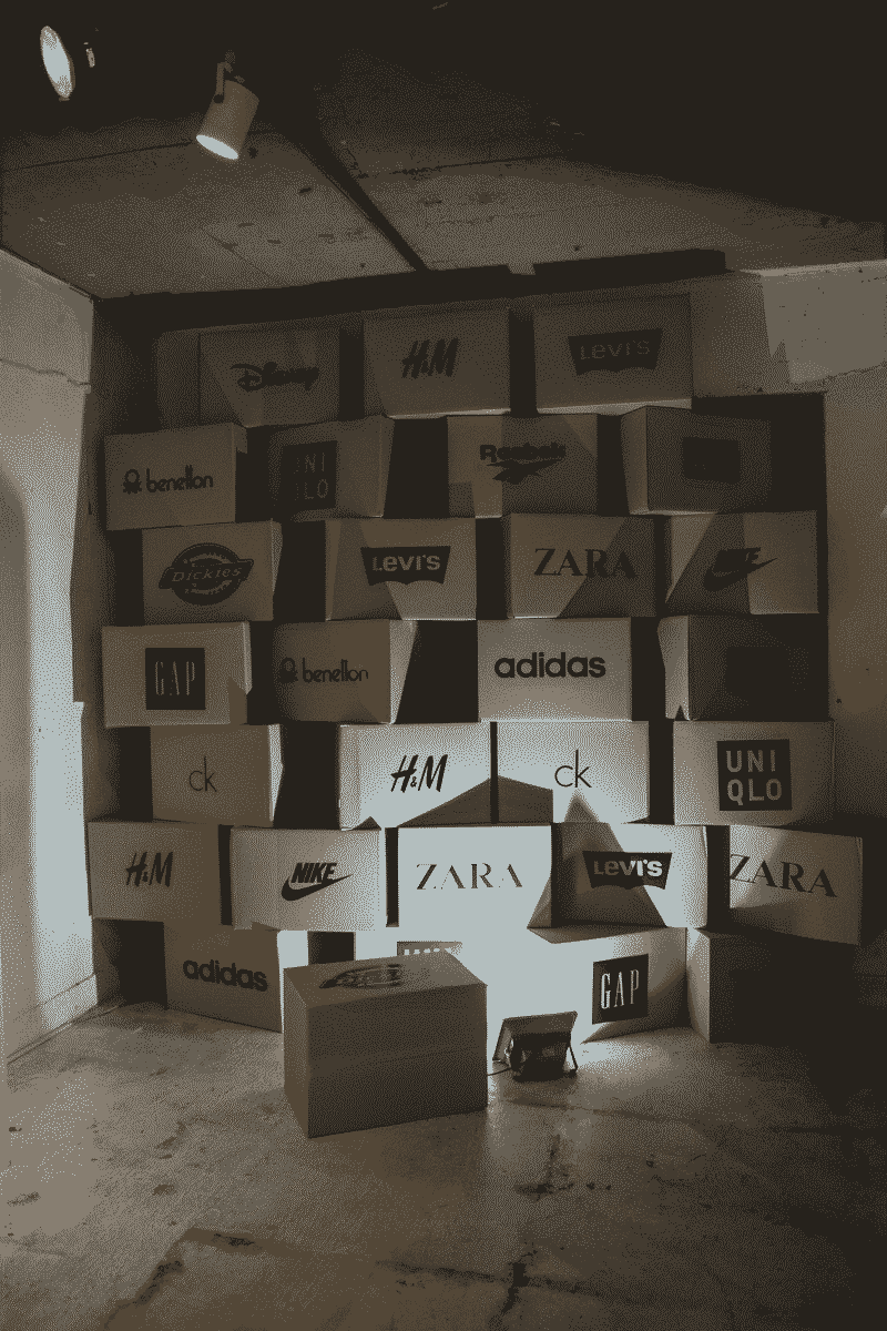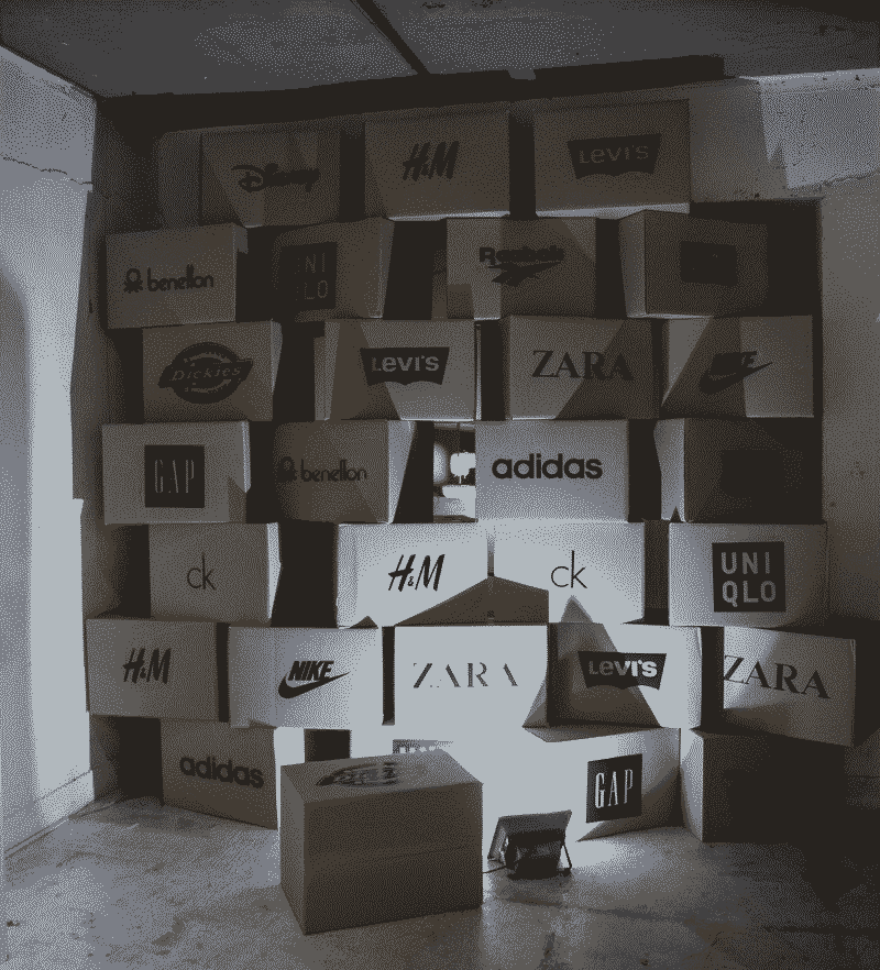 Origin is an installation that examines the invisible structures sustaining global fast fashion. A wall made of boxes marked with familiar SPA brand logos stands as a symbol of mass production and consumption. Behind this wall, a single sewing machine flickers every five seconds, emitting light and mechanical noise. The rhythmic pulse evokes both the persistence and exhaustion of industrial labor—revealing the distance between the polished surface of consumer goods and the human effort that sustains them. Through this contrast, the work encourages viewers to reconsider what lies beyond the garments they wear.